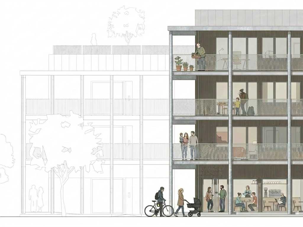 Den slutna kvartersbyggnaden med varierande antal våningar omsluter den gemensamma innergården och ser till att den både blir solbelyst och bullerfri. Byggnaden är relativt smal och har möjlighet till loftgång på ena sidan och generösa balkonger på andra. Samtliga lägenheter är genomgående. Lokaler möter gatan och skyddsrum placeras på entréplan mot järnvägen.